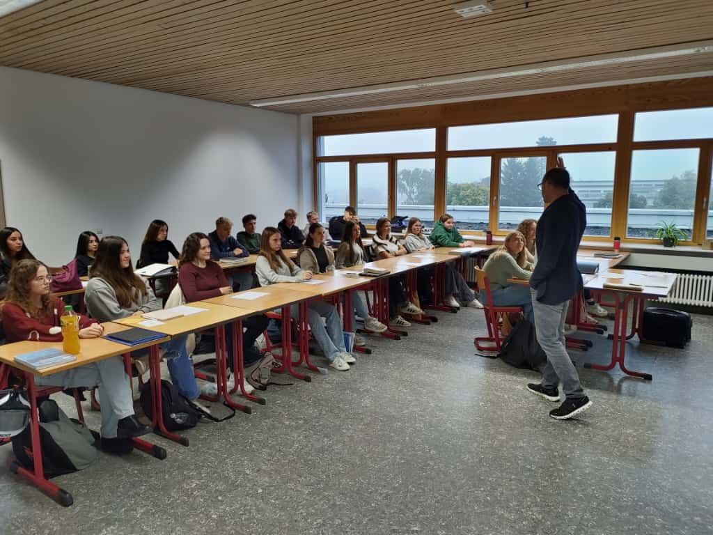 Kurz darauf folgte am MHG ein weiterer wichtiger Programmpunkt: Der für unsere Schule zuständige Berufsberater der Agentur für Arbeit, Stefan Feuerstein, hielt einen Vortrag mit dem Titel „Wege nach dem Abitur“. Hier ging es um die unterschiedlichen Ausbildungs- und Studienmöglichkeiten sowie um Wege der individuellen Orientierung. Die Jugendlichen konnten sich mit Fragen wie „Bin ich eher der Typ für eine Ausbildung oder für ein Studium?“ auseinandersetzen und erfuhren, welche Unterstützungsmöglichkeiten es bei der Entscheidungsfindung gibt. Außerdem diente der Vortrag als Vorbereitung auf den landesweiten Studieninformationstag am 19. November 2025, an dem die Schüler*innen der J1 eine Hochschule ihrer Wahl besuchen werden.