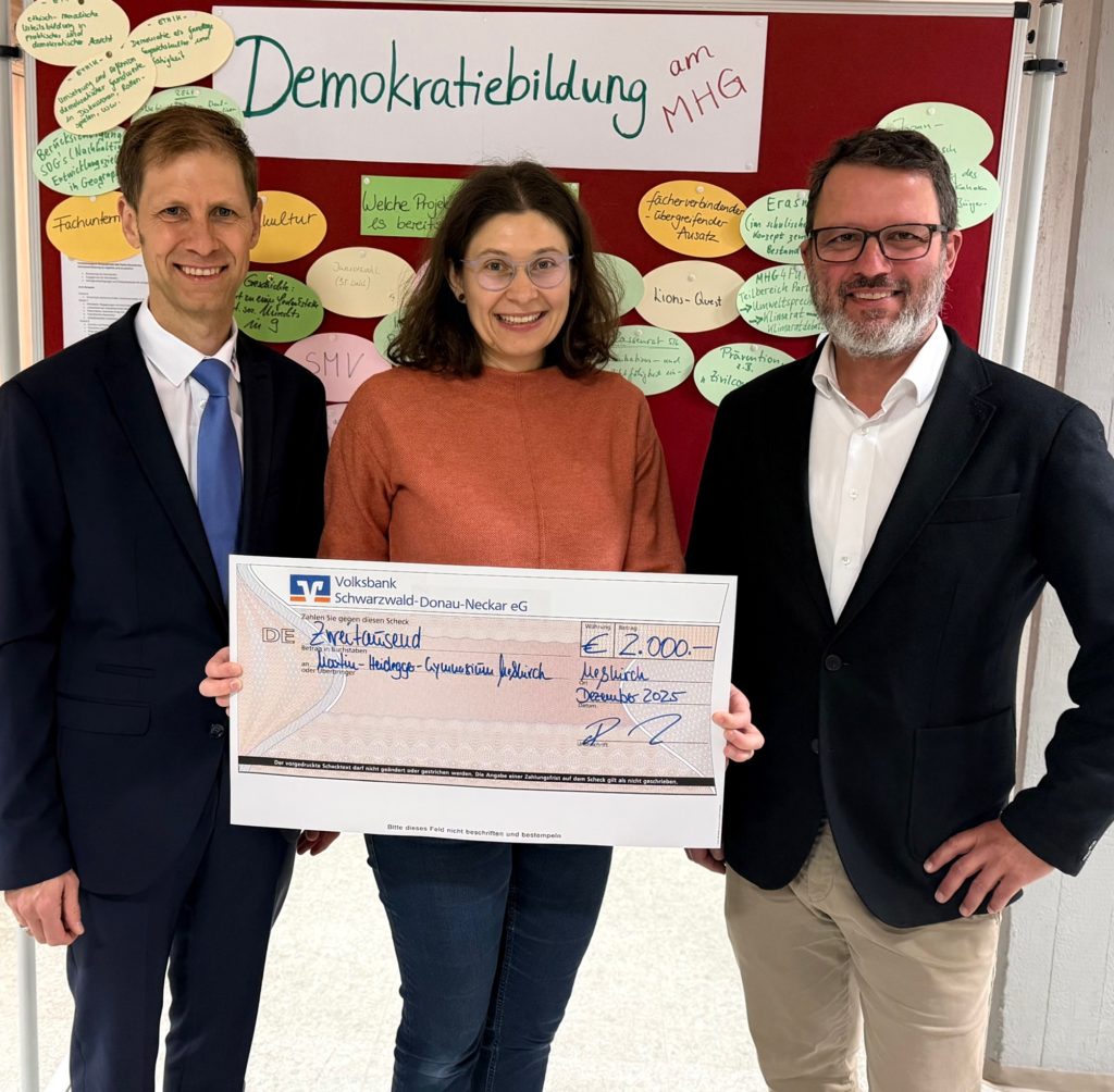 Eine großzügige Spende über 2000 Euro erhielt das Martin-Heidegger-Gymnasium von der Volksbank Schwarzwald-Donau-Neckar. Vorstand David Winterhalder überreichte den Scheck an Juliane Holland und Schulleiter Tobias Andelfinger. Frau Holland koordiniert die viele einzelne Bausteine umfassende Demokratiebildung am Gymnasium, wofür der Großteil der Spende eingesetzt werden wird. Beide bedankten sich ganz herzlich für die finanzielle Zuwendung, mit der wichtige Vorhaben verwirklicht werden können.