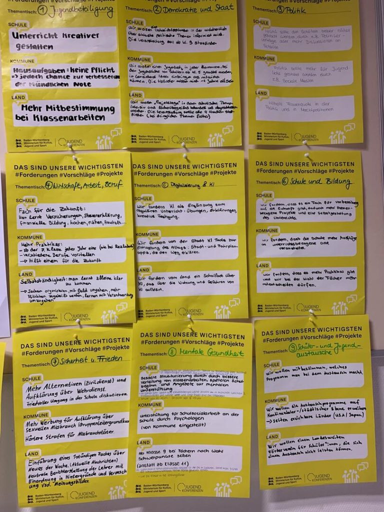 Die Jugendkonferenzen sind ein Format, das vom Kultusministerium und der Jugendstiftung Baden-Württemberg angeboten wird. Unter dem Motto „Deine Stimme zählt“ tauschen sich Jugendliche ab 14 Jahren zu Themen aus, die ihren Alltag prägen und beeinflussen. Mit diesem Instrument der Meinungsbildung sollen Jugendliche dazu ermutigt werden, wichtige Themen zu diskutieren und sich persönlich zu positionieren.