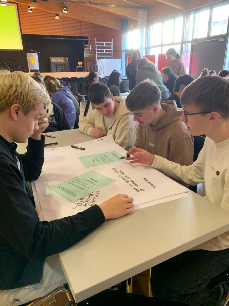 Zur Eröffnung der Konferenz begrüßten Schülersprecherin Sofia Mazur, Schulleiter Tobias Andelfinger und Bürgermeister Arne Zwick die Anwesenden und wünschten spannende Diskussionen und produktive Ergebnisse. Nach einem kurzen Warm-Up folgte die Konferenz dann dem vorgegeben Format. In der Halle am Feldweg waren 10 Thementische aufgebaut. Bei dem sogenannten „Speed-Café“ wechselten die Schülerinnen und Schüler im Minutentakt die Tische, an denen sie sich konzentriert zu den einzelnen Themen austauschten und erste Standpunkte schriftlich fixierten. Im folgenden „Deep-Café“ wählten die Jugendlichen ein Themengebiet aus, mit dem sie sich vertieft beschäftigen wollten. Die Auseinandersetzung sollte in der Formulierung von Forderungen an Entscheidungsträger münden. Von jeder Gruppe war jeweils eine Forderung an die Schule, die Kommune und das Land verlangt.